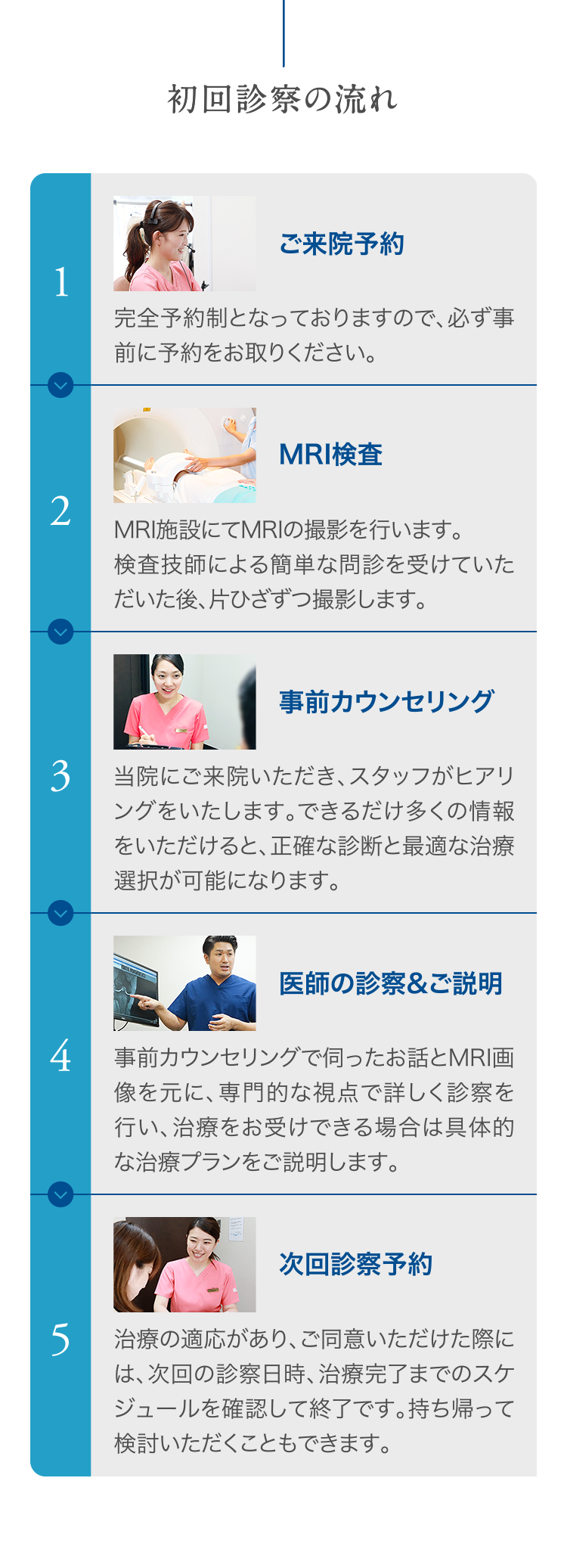 事前カウンセリングで伺ったお話とMRI画像を元に、専門的な視点で詳しく診察を行い、治療をお受けできる場合は具体的な治療プランをご説明します。