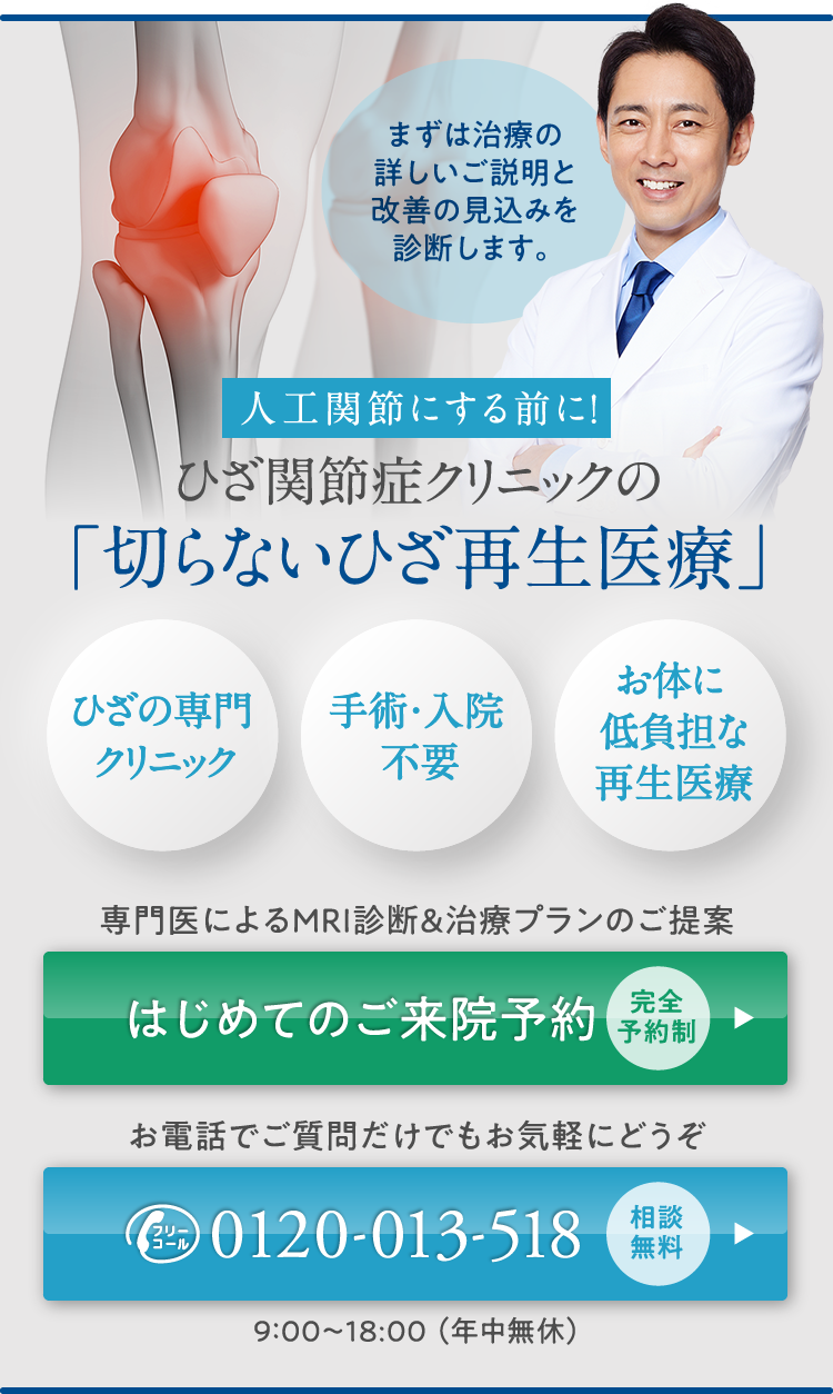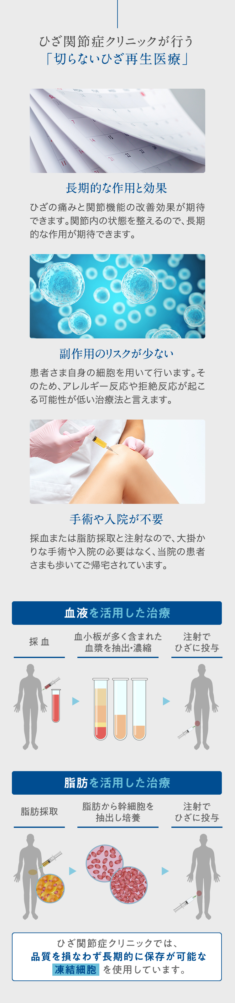 いずれも患者さま自身の細胞を用いる治療なので、理論上、拒絶反応などのリスクは少ないと考えられます。実際、ひざ関節症クリニックグループにおいて、本治療による重篤な副作用は、これまでのところ確認されていません(治療後数日間、腫れや熱感といった症状が出ることはあります)。